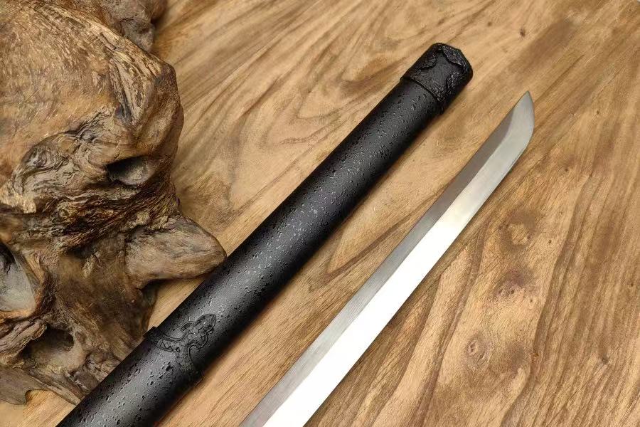 The blade is real 65Mn manganese steel, fully heat-treated for proper hardness and resilience. The handle and scabbard are made to measure, hand-fitted to the blade and mounts with tight tolerances—no universal sizing, no forced fit.