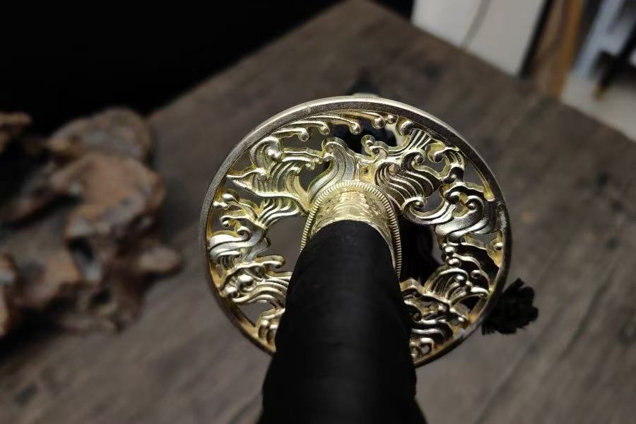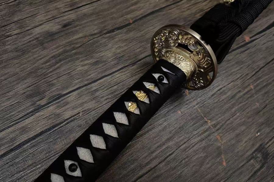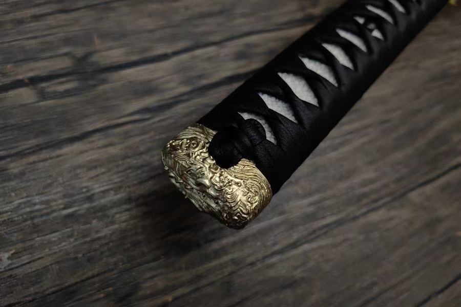 Full brass fittings: tsuba, kashira, fuchi, menuki, habaki, seppa, and kojiri
