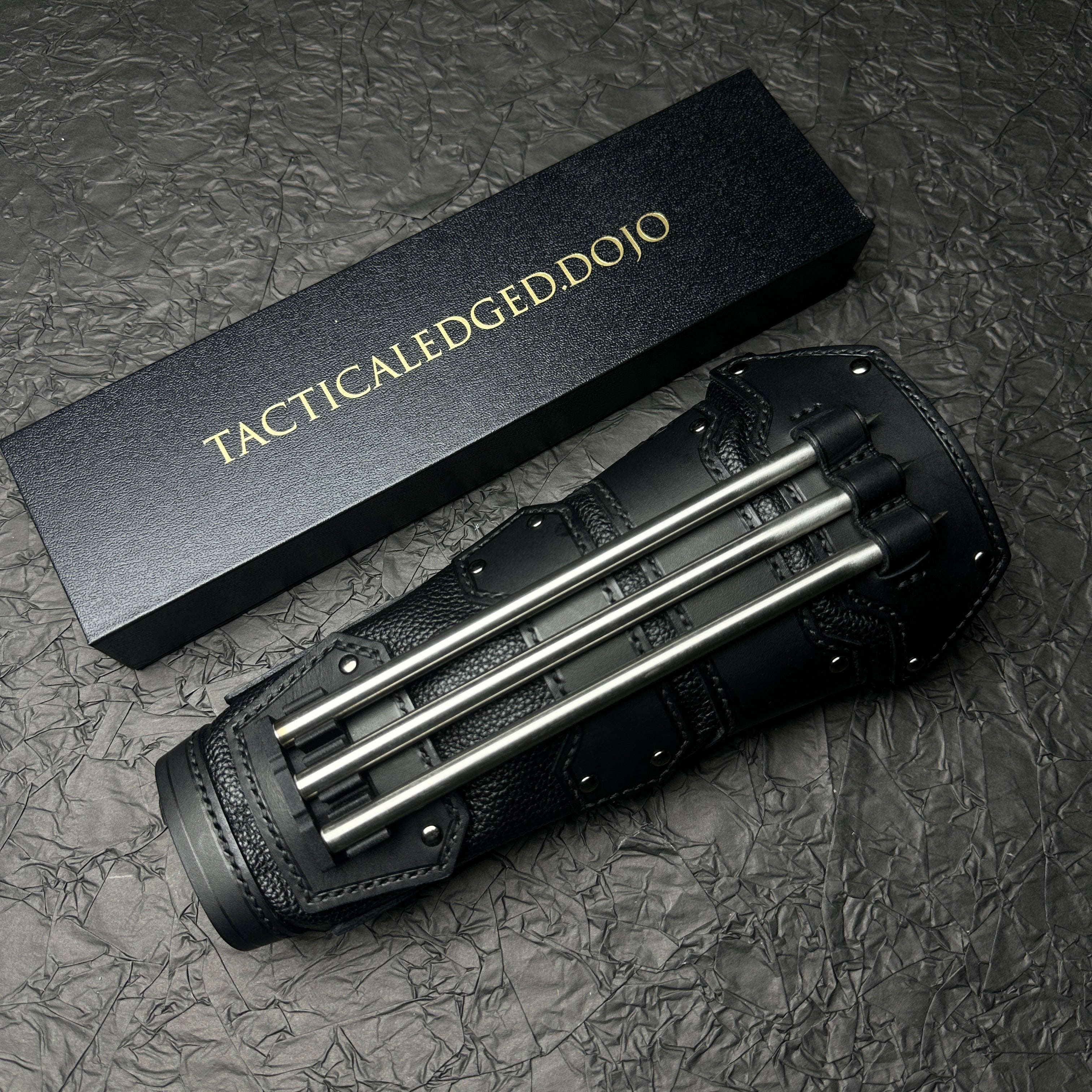 Elevate your martial arts gear with our latest innovation, the "Kirin" Vambrace. This sleek, leather-bound accessory is designed to seamlessly integrate form with function, providing a stealthy and stylish way to carry your Bo-Shuriken.